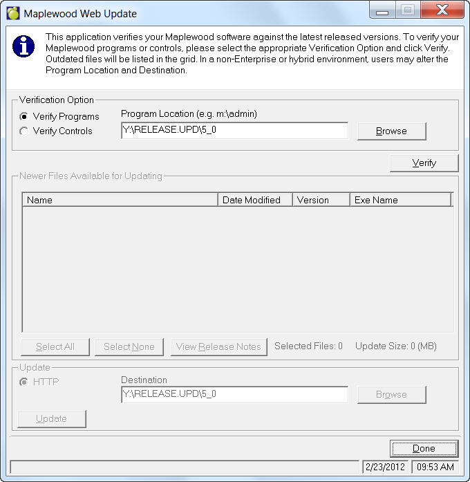 7. Enter a Destination or click Browse and navigate the update location. The Destination will automatically look to the program location from where the current Maplewood session is running and will match the above Program Location. If there are multiple program locations or if the indicated path is incorrect, click the Browse button.