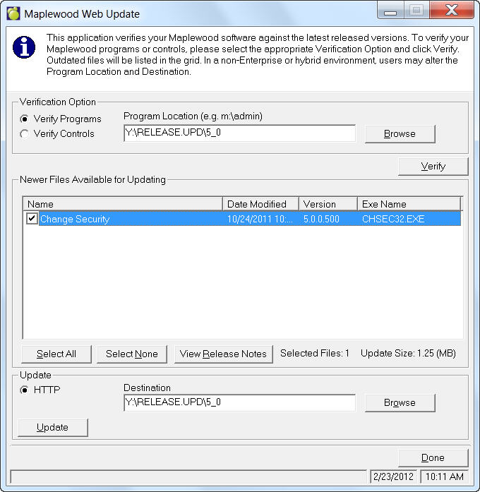 Technical Notes: During the update process, the webservice packages files one at a time and zips them. The files are then sent to the client to the under the specified path. After received, the files are automatically extracted to the specified path and the temporary zip file is removed. While this process is in progress, a status report is displayed. If the process is unsuccessful, the zip file remains in the specified locations and the user can go to the program file and manually unzip the file. Add and delete permissions to the PR, WPR, Controls and WKSTN folders are required.