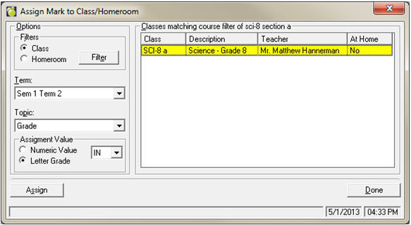 Define the filter as required (make sure only the classes to which you want to assign the mark are selected!) and select the desired Term and Topic. Either enter a numeric mark or select Letter Grade to select the value you wish to assign. Click Assign. You may receive an error report if the selected Term and Topic are not assigned to the selected class(es).