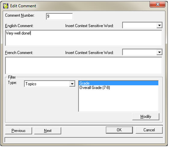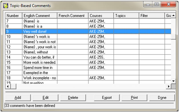 Choose Marks, Topic-Based Marks, Define List of Comments. Use Add, Edit and Delete to set up the school list of comments.