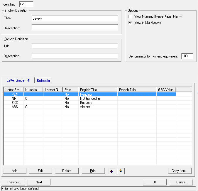 Choose Marks, Define Letter Grade Groups.