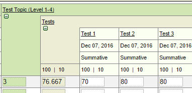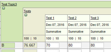 (70, 80, 80 = 76.67 which displays as a B in the Topic)