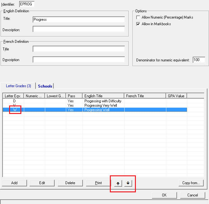 When editing a Letter Grade Group, select a letter and click the up and down arrows at the bottom to move that letter up and down in the list. The letters will display in this order for the teachers.