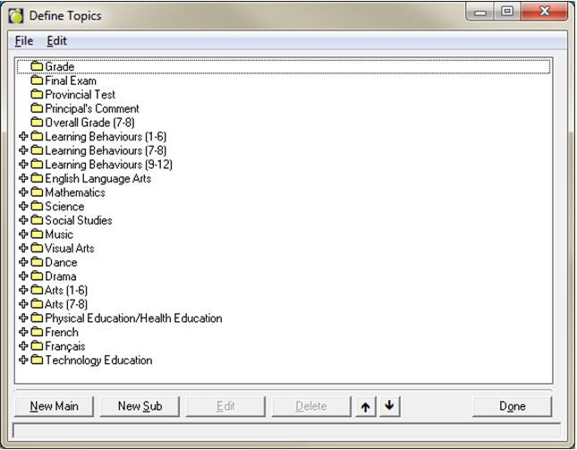 Click the plus sign beside a main topic to see its subtopics.Click on a topic and use the arrow buttons on the screen to move that topic (and its subtopics if applicable) up and down. This order affects all mark-entry screens in Maplewood connectEd and the Maplewood for Windows interface.