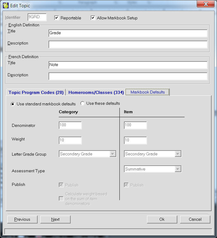 When editing or adding a topic, you will see a new tab called Markbook Defaults. Check the box to use these defaults instead of the built-in markbook defaults, and define a new default denominator, weight, letter grade group, published status, etc for all newly-added markbook items and categories. These defaults will not affect existing markbook items or categories.