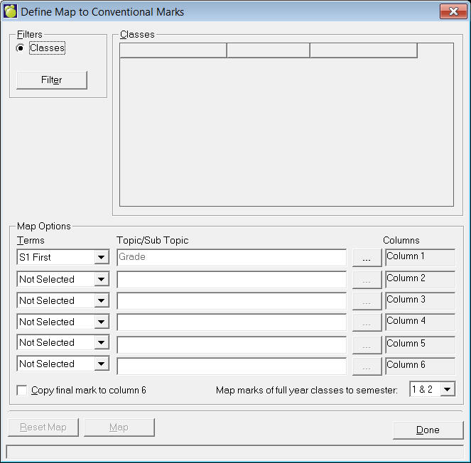 Caution: Once defined, the marks will continue to be updated to Maplewood. To stop the transfer of marks, the column specification must be reset to Not Selected.