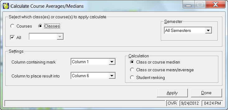 Often you may want to place a mark/grade in one marking/grading column representing a course median. The marks/grades feature of the administration system provides a feature for you to calculate course/class medians and means. Calculate Averages/ Medians will only calculate averages and medians for numerical marks/grades in the marking/grading columns.