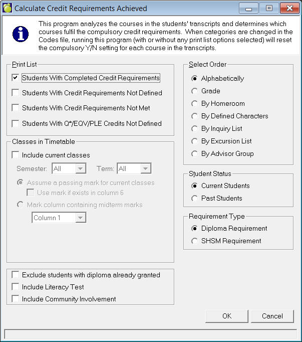 Note: When both checkboxes are checked, the program will report students who have completed their credit requirements as well as completed their community hours and literacy test.