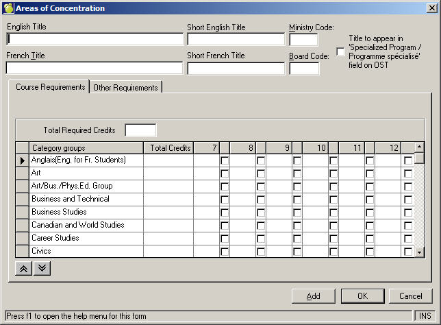 Enter or edit the course titles and ministry/board codes. The list of categories is pulling the titles from the category groups file. If you are missing some categories, you will need to add entries to the Category Groups file (see Define Category Groups).