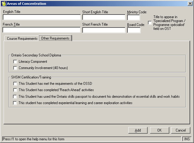 Use the Other Requirements tab to enter Diploma and SHSM Certification/Training information.