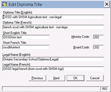 When you add a Diploma, you will be asked to enter an English and/or French Title, an English and/or French Short Title, a Ministry and Board Code, and a Legal English and French name.