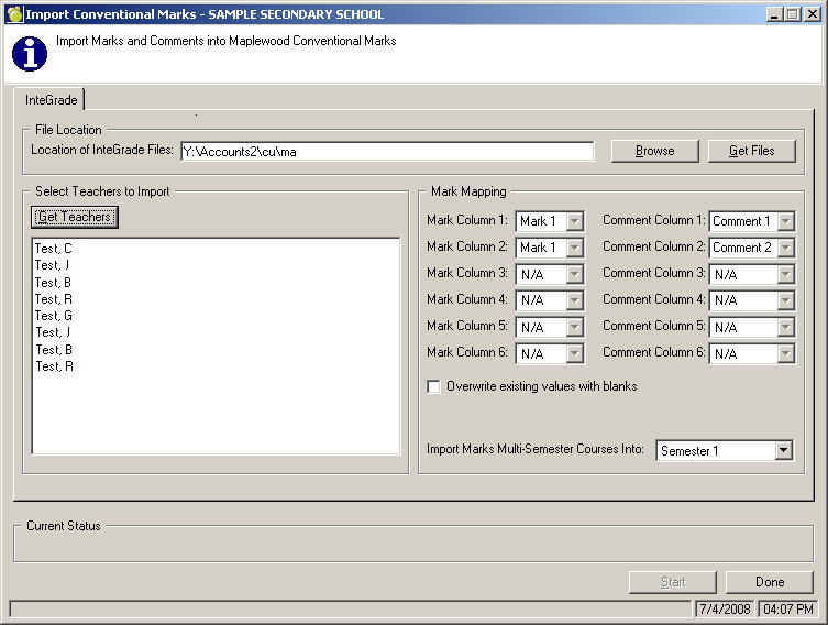 Please note, all functionality as it pertains to InteGrade and Maplewood is contained within the Conventional Marks area of Maplewood. For schools that exceed two semesters, it is not possible to use Conventional Marks, and therefore not possible to import and export to InteGrade. It is also recommended that schools restrict security to the Topic Based area of Maplewood if using the integration with InteGrade so as not to create confusion.