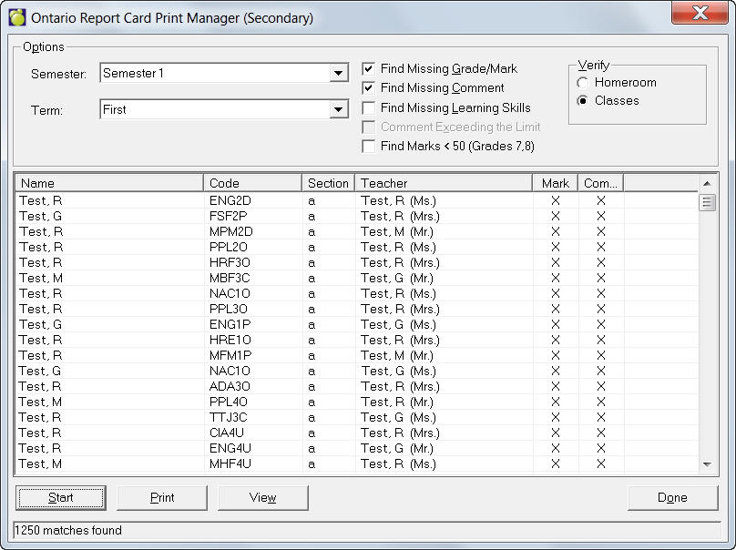 The Ontario Provincial Report Card will now include a printout at the end of printing that indicates if there are any students with potentially incorrect credit breakdowns, due to duplicate codes in the codes file. If you have someone report that the credit totals are out on the final page, there should be a printout at the end of the print job that indicates the students name, and the code that is duplicated. Making the code unique in the codes file will correct the credit breakdown.