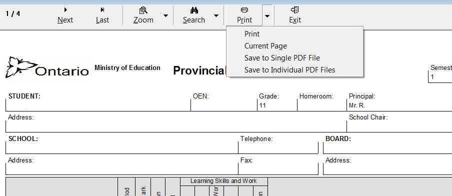 View Button (Print Preview) - Export to Individual PDF. The ability has been added to export individual report cards to PDF. In the Print Preview screen, select the arrow beside the Print button. "Save to PDF" has been changed to "Save to Single PDF", and "Save to Individual PDF" has been added. The option to save to individual PDF will create one file per student in the Print Preview, with the file name as the student's OEN number. The files will be created in the school's data folder, under Reports\ONRE\date(yyyymmdd). At the end of the export a prompt will display, asking the user if they wish to open this file location