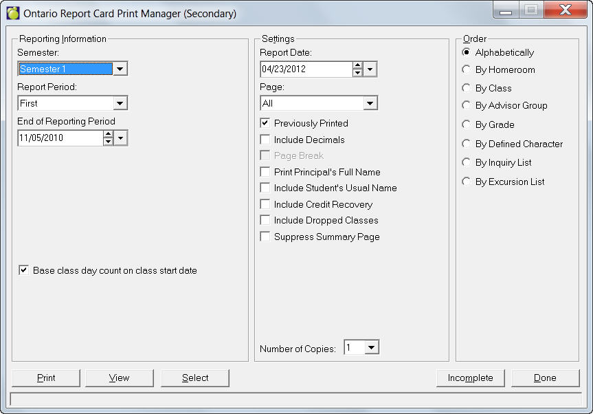 In the Settings frame you will need to specify the Report Date and Page(s). Below, click Previously Printed only to print cards for students not previously printed and Include Decimals to print numeric values not rounded up, e.g. 79.54. There also is the option to specify page breaks, print the principal's full name, include the student' usual name and not print the summary page.