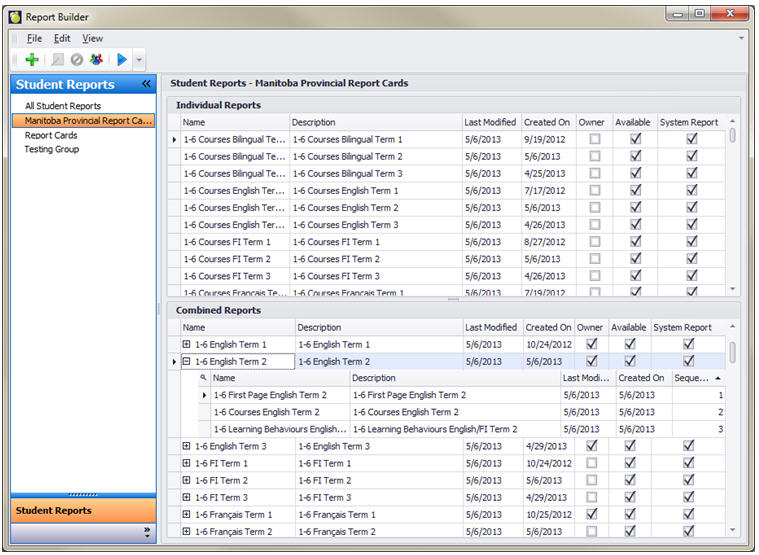 The Individual Reports are the templates that are built using the Designer. An Individual Report can be run on its own, and can be shared out to schools on its own. Individual Reports can also be used in Combined Reports (below).