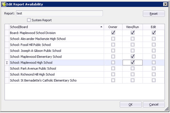 After a report has been created or imported, it can only be run by the entity that created it. This is usually the Central Office, but schools can also create their own reports. Either way, before a report can be used by another school, it must be shared out to that school.