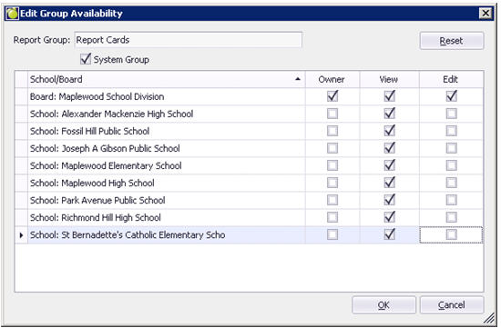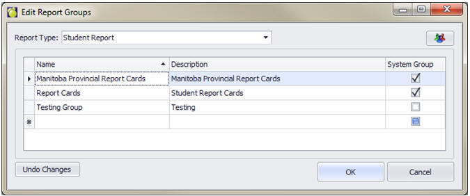 Any number of groups can be created, to help you organize you reports. The system group “Report Cards” (as well as “Manitoba Provincial Report Cards” in the Manitoba jurisdiction) cannot be edited.
