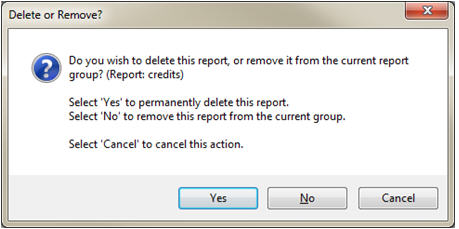 If the user selects a report and hits the <Delete> key on the keyboard or clicks the Delete Report button, the confirmation message box will confirm whether to permanently delete the report (Yes button), remove the report from the existing group (No button), or cancel (Cancel button). Please read the message carefully and respond accordingly.