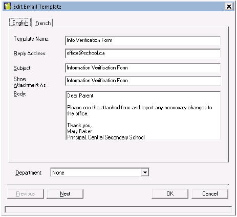 Next, define Email Templates. In the school, go to File – School Setup – Email Templates. Click Add to create a new
