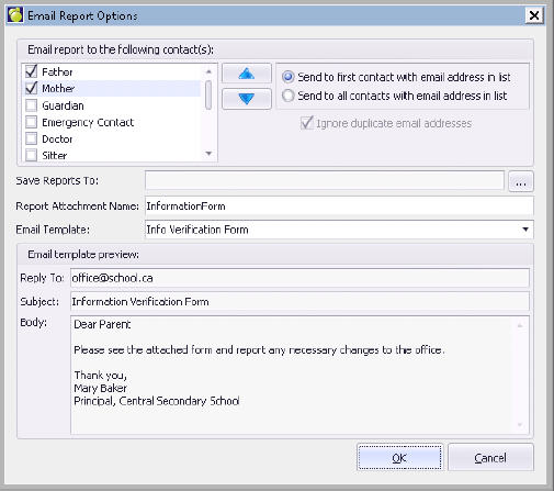 Click OK to send. This will send one email message to each selected contact, for all students listed in the Run screen.
