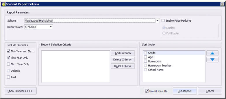With one or many schools selected, leaving the selection criteria box empty will print ALL students. Use the Show Students >>> button to show which students are going to print.