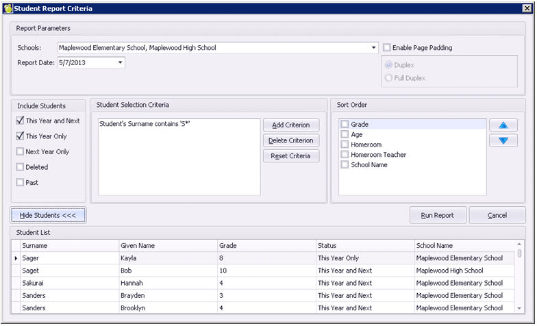 The criteria are inclusive. This means that if many criteria are defined, the list of students will narrow down even more. Using the above example, if we added a grade (under Personal Details) of 8, the list of students would be narrowed down to those with surnames beginning with S, AND in grade 8.