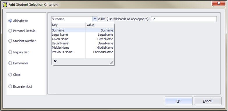 In the following example we have selected Alphabetic, and the options available become visible by clicking the drop down arrow. We have selected Surname, and input the text “S*” which will narrow the list of students down to only those whose surname begins with S.