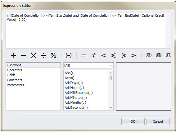 Two methods are available for giving your calculated field a value. Using the Expression is more straight-forward, but Scripts are sometimes necessary for things that are not available in the Expression Editor. Anything that is school-defined (see examples below) cannot be accessed through a simple expression and must be defined using a script.