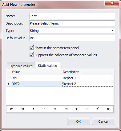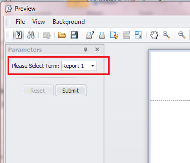 In Report Builder for Report Cards, once the report has been run, the parameter will be available in the top right corner. It will be set to the default value. The user can select the other values from the list then click Submit to refresh the report for the new term. The description appears as the text prompt that the user sees.