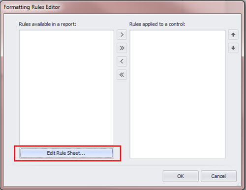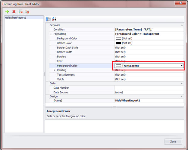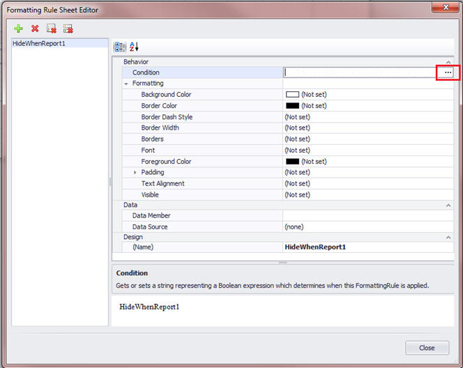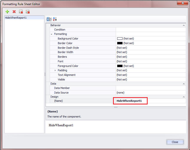 At the Formatting Rules Editor, you still need to apply this rule to this control (the cell). Choose HideWhenReport1 and click the arrow to move it over to the right hand pane.