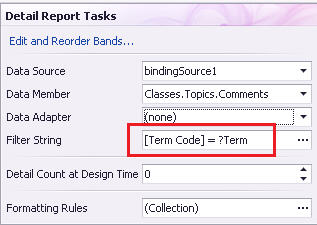Create a Comments band beneath that, and use this as the Filter String: [Term Code] = [Parameters.Term] The Filter String will end up looking like this: