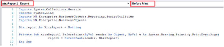While in the Scripts pane, find xtraReport1 in the first dropdown and then find BeforePrint in the second dropdown. This will link xtraReport1 up with the before print script.