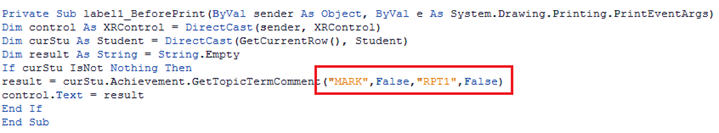 1. Attendance total boxes: hiding and showing text based on the selected term is fine for the monthly or term attendance boxes (use the transparent text method used in this document), but for the attendance totals, you may need to have several labels each with their own rule applied. For example, if there are three terms on your report, you will have to have three text boxes. Set them all to Visible = No. Then, bind each one in the following way: