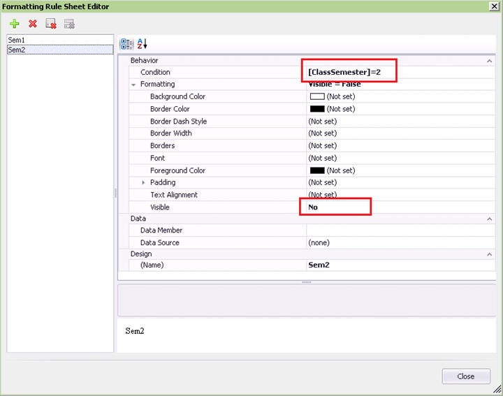 e. Create a formatting rule on the DetailReport-Classes for the semester 1 band, to set the band to invisible if the value of ‘ClassSemester’ is 2: