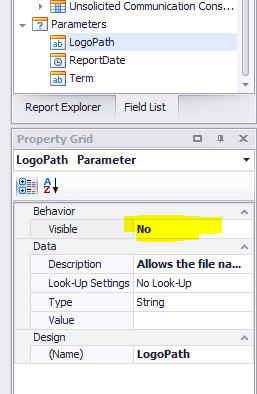 While you are in the Parameters area, find LogoPath and ReportDate and set them both to not visible. You will see the properties of the Parameters in the bottom right hand corner of the screen, if you choose one from the list. E.g.: