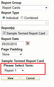 In Maplewood connectEd, the parameter will be available before run time. The user can select the desired term, then select their students then click View to generate the report.