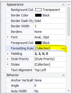 To create the rule, select the first Report 2 mark cell, and find “Formatting Rules” in the list of properties. Click the ellipse icon to begin building a rule: