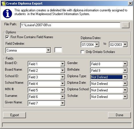 Maplewood has a program that determines all the students, both past and present, who have an entry in their first diploma field, and it distinguishes between those that graduated with and without Ontario Scholarship qualifications. This program can be used to choose groups of these students for printing, thereby assisting in determining the accuracy of the Ministry's records.