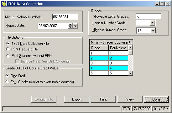 Reports, 1701 and PEN Data Collection, Create 1701 Data Collection File, select the Contact Info button, Surname and First Name Note: Actual name of school contact must be entered. Adding School Secretary is not an acceptable entry by Ministry standards. Information must be entered before creating the PEN Request File |