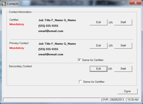 Select the Contact Info button. Upon selection, a form (see below) will display contact information that will be sent to AANDC. Contacts that are mandatory for the export file have the word ‘Mandatory’ in red. If the contact is the same as another contact then the information can be copied using the ‘Same As’ option. The user has two ways of editing the information (by choosing from the staff list or editing the information manually). If the mandatory contacts are not filled in a message will be displayed indicating which contact is missing when the user selects the `Create` option. The creation of the file will not proceed until all mandatory contacts have been entered.