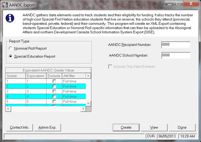 3. Indicate the mapping of grade equivalents (i.e. a grade of J in Maplewood should be printed as a grade of JK on the AANDC Special Education Export), as well as the Attendance Type offered for each of these grades. Most grade will have Full-time selected, however the Junior Kindergarten and Kindergarten programs may have half time selected - if the school only offers a half day program.