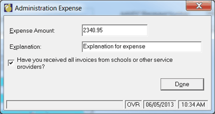 Select the Admin Exp. button to enter in the Administration expense for the school and the Explanation.