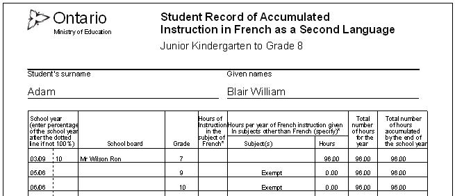To access the French Card, choose Reports, French Card. Here you can print Hours of Instruction and other French Hour related topics such as Total Number of hours given in subjects other then French. Below is a sample print-out showing what areas are printed. You can choose from current or past students.