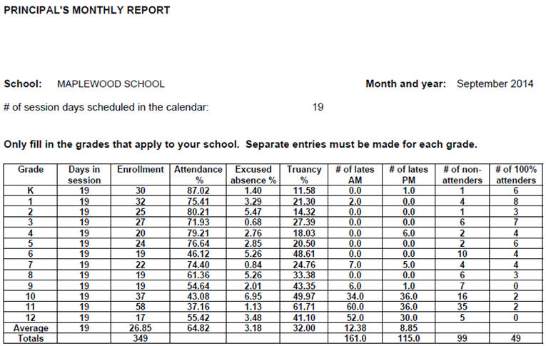 This report provides Nunavut Principals with a grade-by-grade breakdown of Attendance percentages and statistics for a specific month in the current school year. There are two sections to the report: