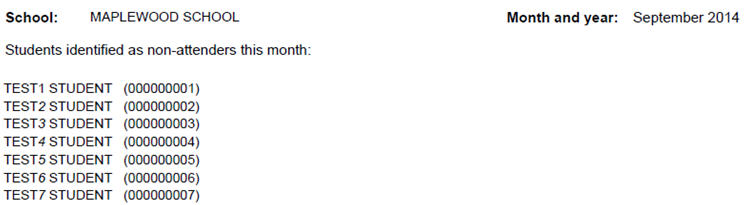 Students Identified as non-attenders this month: list of student names and their GNID for each student identified as missing school more than 60% of the month.