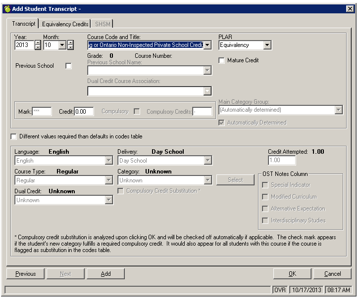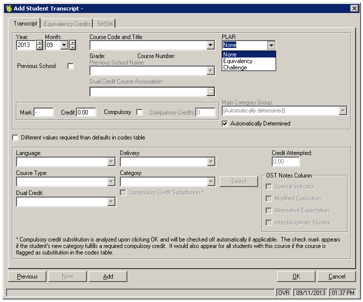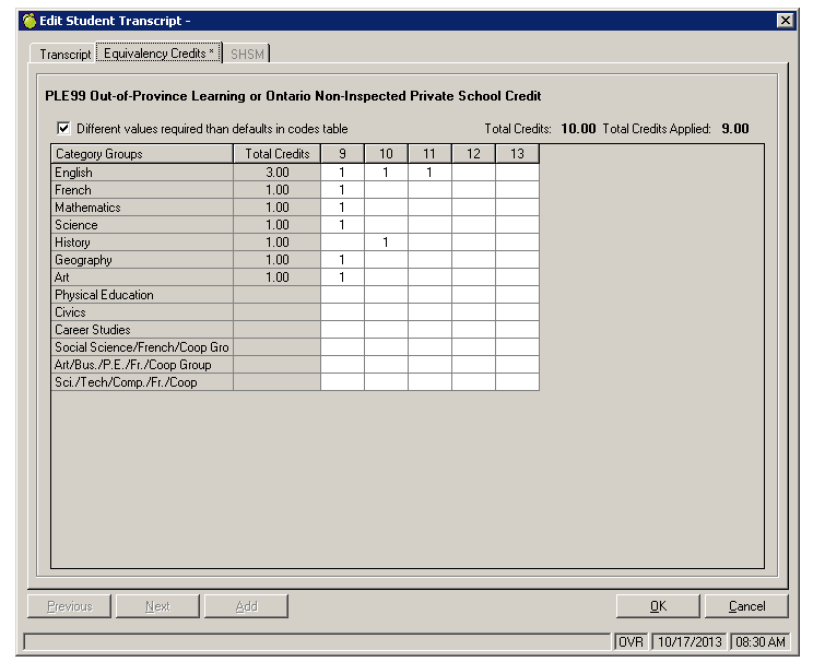 If a PLE course code is selected, the PLAR type is automatically set to 'Equivalency', and the Equivalency Credits tab becomes active. The Previous School information (if applicable), Mature Credit (if applicable) and Total Credits should be entered prior to selecting the Equivalency tab. On the Equivalency select the option 'Different values required than defaults in codes table'. This will activate the grid below and allow you to enter the number of credits for each grade and each requirement that the Equivalency Credit will be applied. Note: Some schools have a category group called 'Optional Credits' while others do not. For schools that do not have this category group, only enter the compulsory credits that are being granted with this credit. The remainder of credits (from the Total Credits entered on the first screen) will automatically count toward the optional credit component of the requirements.