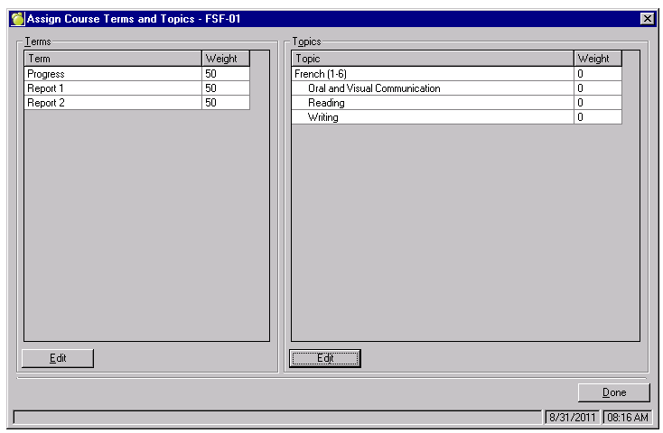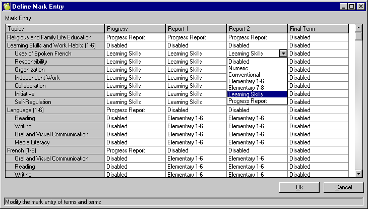 Follow the easy-to-use Report Card Wizard to set up Terms and Topics as required by the Grade 1-6, Grade 7-8 and Grade 9-12 Ontario Provincial Report Cards. Choose Marks/Grades, Topic-based Marks, Wizard.