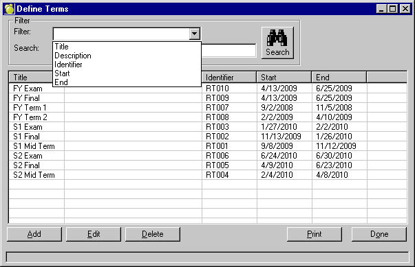Users have the ability to filter the display of terms based on title, description, identifier, start date or end date.