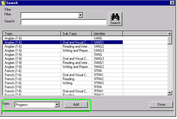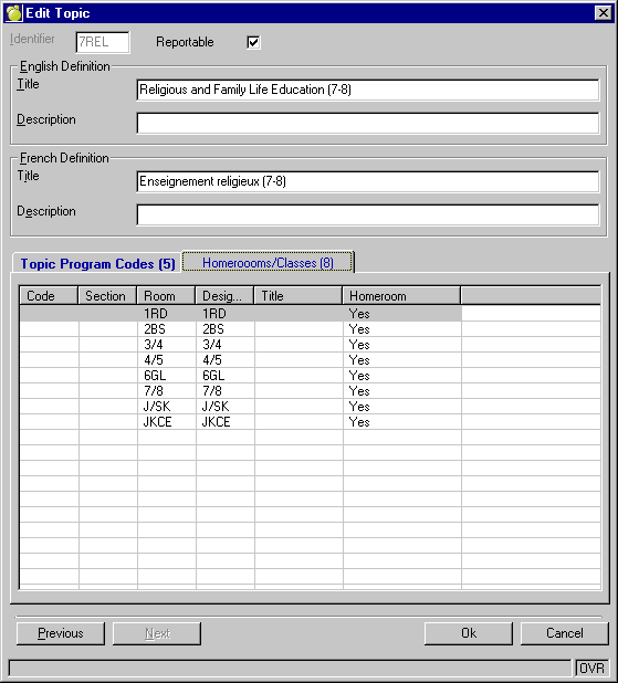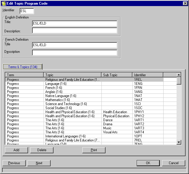 The Topic Program Code (pre- 2010 this was referred to as Identifiers) refers to those special areas that are required for reporting (checkboxes that appear on the Ontario Provincial Report Card), specifically IEP, ESL/ELD, and NA (with the latter only being added for Elementary reporting purposes).